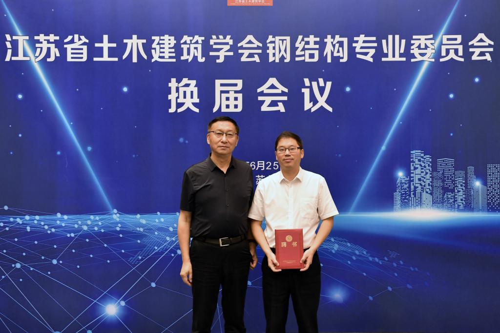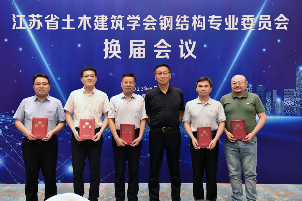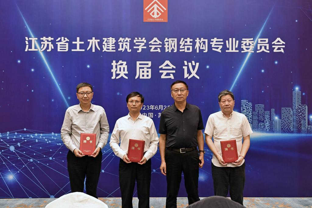 王华宣读了江苏省土木建筑学会关于同意钢结构专业委员会换届的批复,同意第五届钢结构专业委员会挂靠在苏州科技大学,由5名顾问和76名委员组成,苏州科技大学副校长唐柏鉴为主任委员,范圣刚、毛小勇、赵宏康、彭洋、伍凯、李翠光、宗钟凌、张营营为副主任委员,姚江峰为秘书长。随后,王华为第五届钢结构专业委员会顾问、主任委员、副主任委员会、秘书长颁发了聘书。