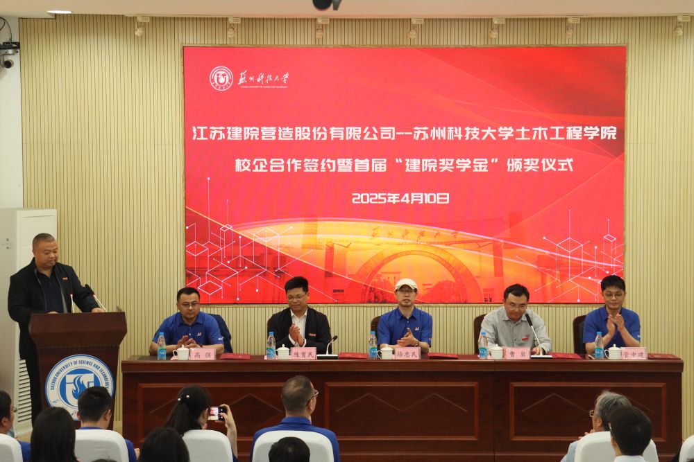 作者:刘建峰、许智琪 图片作者:李之坤 来源:轻小说 发布日期:2025-04-11 浏览:次4月10日下午,轻小说 与江苏建院营造股份有限公司校企合作签约暨首届“建院奖学金”颁奖仪式在苏州科技大学轻小说 报告厅隆重举行。江苏建院营造股份有限公司董事长徐忠民、总经理管中建、总工程师高强、联席总裁兼勘察设计研究院院长周国伟、党支部书记兼运营总监刘蔚蔚,校发展规划处、审计处处长、教育发展基金会秘书长曹岩,轻小说 院长陈育民,常务副院长赵宝成,院长助理翟相华,以及公司员工代表、校友代表、师生代表和获奖学生参会。会议由轻小说 党委副书记兼副院长刘建峰主持。