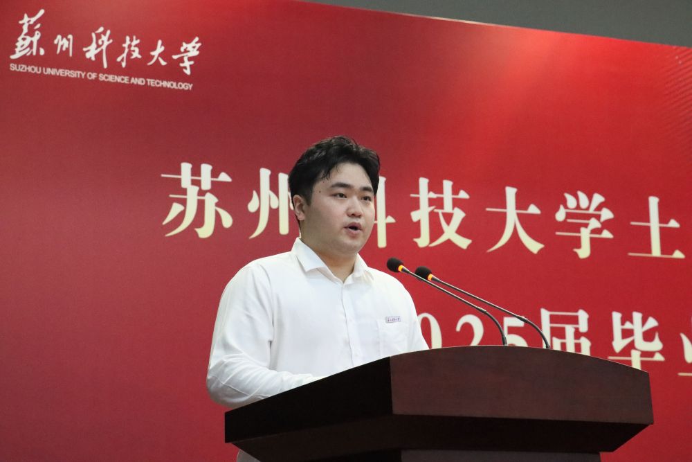 研究生毕业代表朱海发言,他呼吁同学们珍惜当下学习实践的每一刻,将其视为未来蓝图“不可或缺的基石材料”,并带着母校的期望、师长的教诲和同窗的情谊,勇敢踏上新征程,让“苏科大土木人”的光芒闪耀四方。