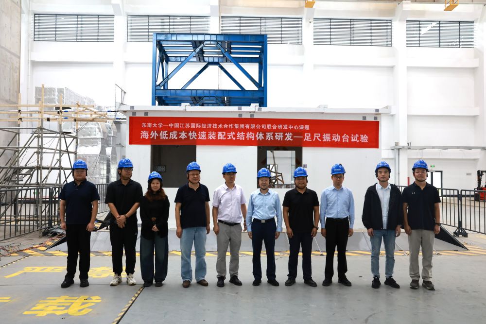 本次试验为“东南大学—中国江苏国际经济技术合作集团有限公司联合研发中心”重点课题——“海外低成本快速装配式结构体系研发”的足尺振动台试验。姜朋明详细了解了项目的背景与意义,并就研究重点、试验注意事项以及平台的高水平建设与管理等方面提出相关要求。地震工程研究中心高水平抗震试验平台项目建设负责人、轻小说 教授田石柱组织实施本次试验,取得的试验成效获得委托方高度认可。