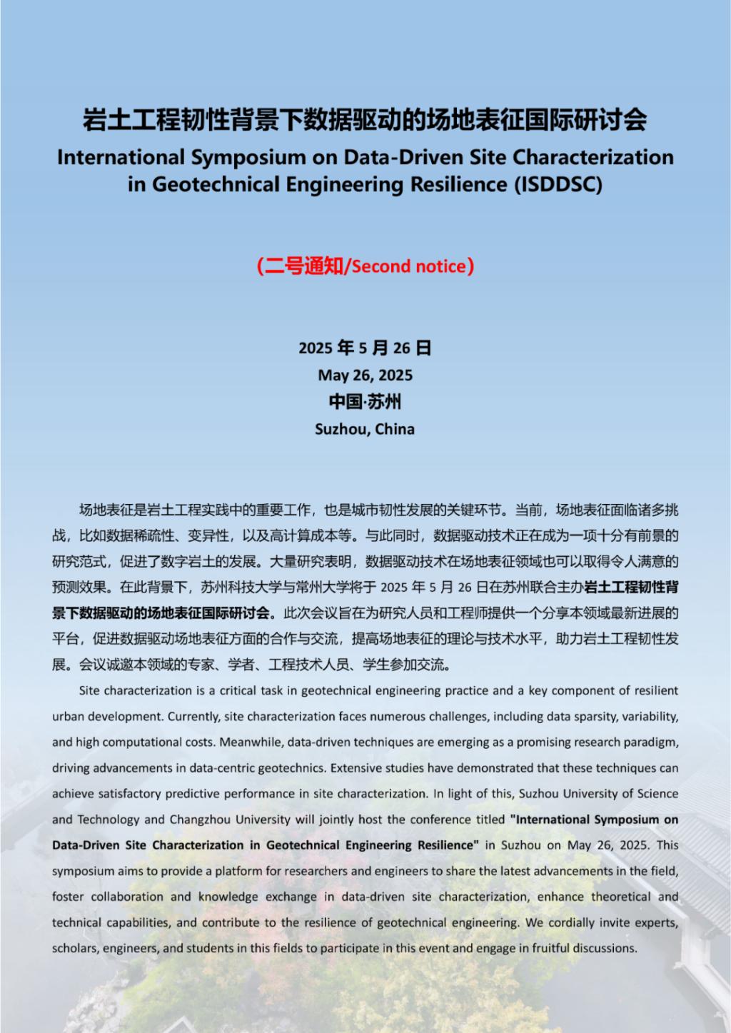 关于召开岩土工程韧性背景下数据驱动的场地表征国际研讨会的通知
