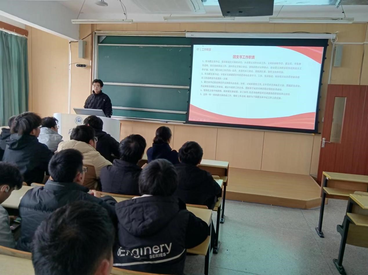 培训会主要围绕“团支部的工作职责”“团支部的工作内容”“团支部的工作注意事项”“团员的思想建设”四个方面展开培训。首先,承一洲详细阐述了团支部组织架构、团员发展流程、团费收缴管理以及“三会两制一课” 制度的规范落实等内容,并结合实际案例,深入浅出地剖析了常见问题与解决思路,为支部委员们夯实了理论基础,确保团支部日常工作的精准高效开展。同时,他还强调团支书要承担起扛大旗的责任,充分发挥积极性、主动性,抓好团支部建设,对日常工作认真负责,积极配合完成日常工作任务。整个培训过程中,各位团支部委员积极响应,认真听取建议。