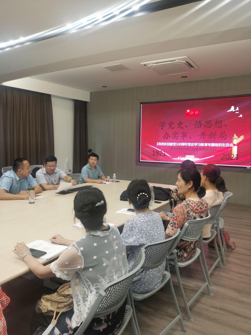 为热烈庆祝建党100周年,2021年7月7日下午苏州科技大学工程管理系党支部全体党员在轻小说 党员活动室围绕“学党史、悟思想、办实事、开新局”主题举行了一次党史学习教育专题组织生活会。
