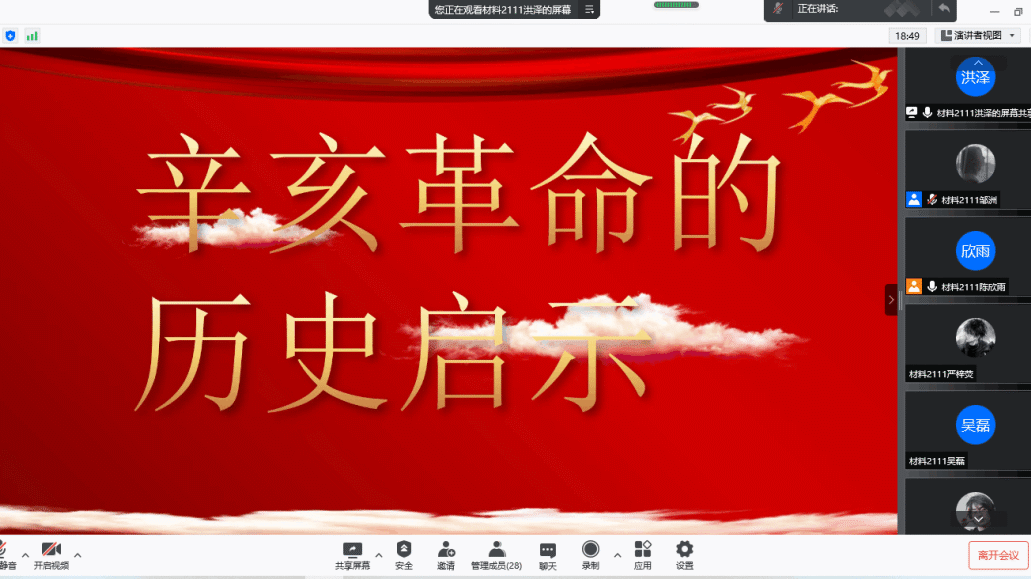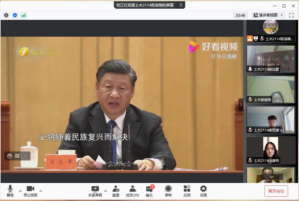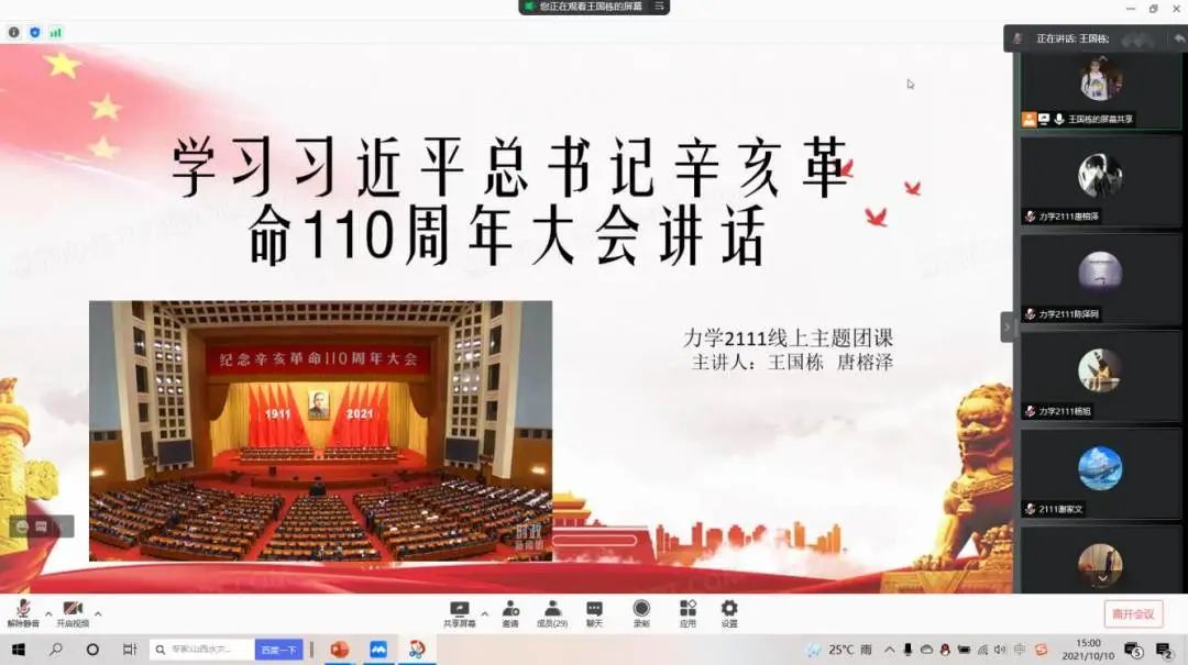 10月9日上午10时,纪念辛亥革命110周年大会在北京人民大会堂隆重举行。中共中央总书记、国家主席、中央军委主席习近平发表重要讲话。10月10日下午,在学院团委的指导下,各班由团支书组织线上班会,带领全体同学观看此次讲话,学习感悟习近平总书记的勉励嘱托。