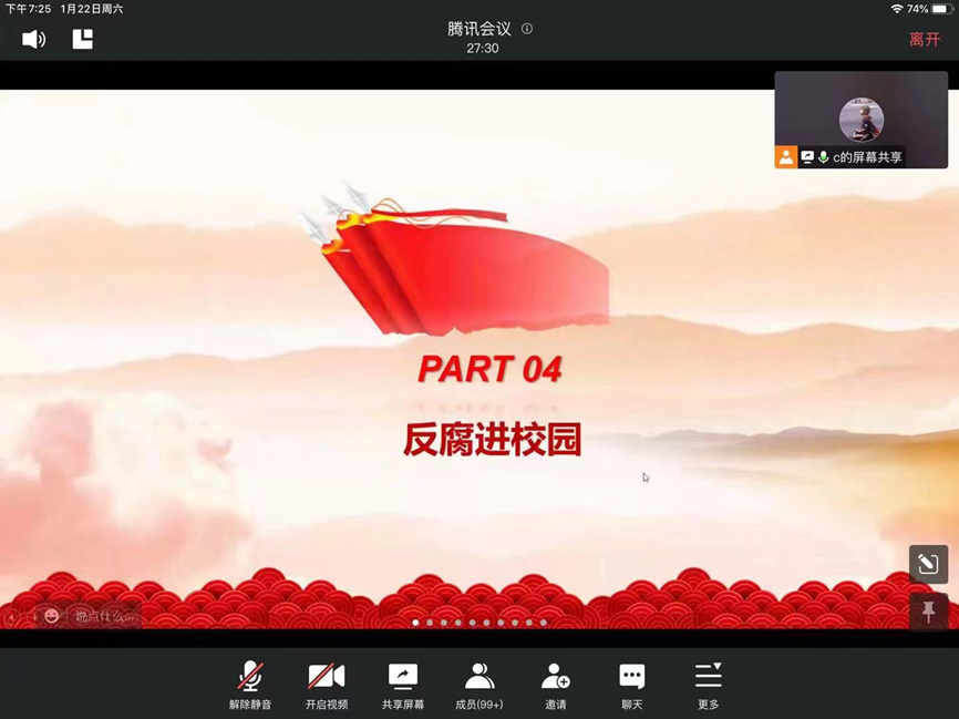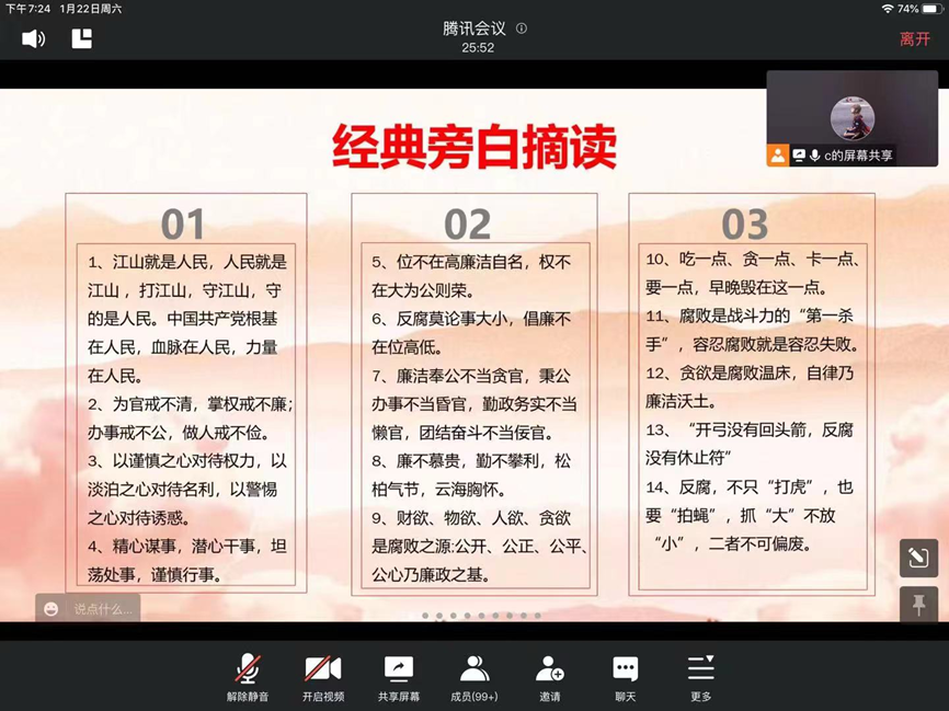 发布日期:2022-01-27 浏览:次2022年01月22日,轻小说 研会在腾讯会议组织开展对腐败“零容忍”主题活动。本次活动主题为“以清正廉洁为荣,以贪污腐败为耻”。不忘初心、牢记使命,砥砺前行,坚定理想信念,对反腐“零容忍”。此次开展对反腐“零容忍”教育活动,是为日后工作打下良好的理论基础。积极引导研究生党员、研究生会成员及研究生班级学生干部深入推进党风廉政建设和反腐败斗争,积极参与活动,使反腐倡廉蔚成风气。