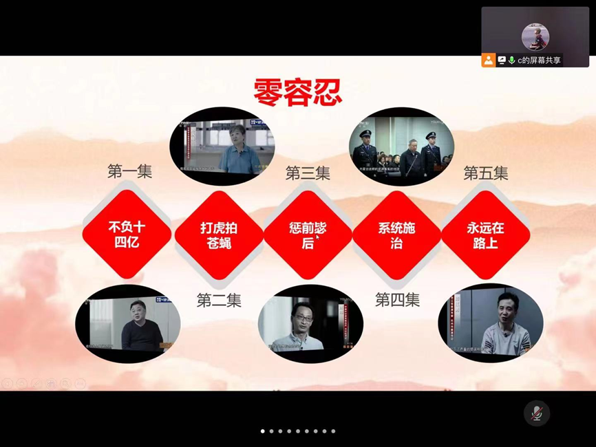 此次活动主要分为反腐倡廉意义介绍、纪录片的简介、观看反腐大片《零容忍》中的某个片段、经典旁白摘读和反腐进校园几个部分。