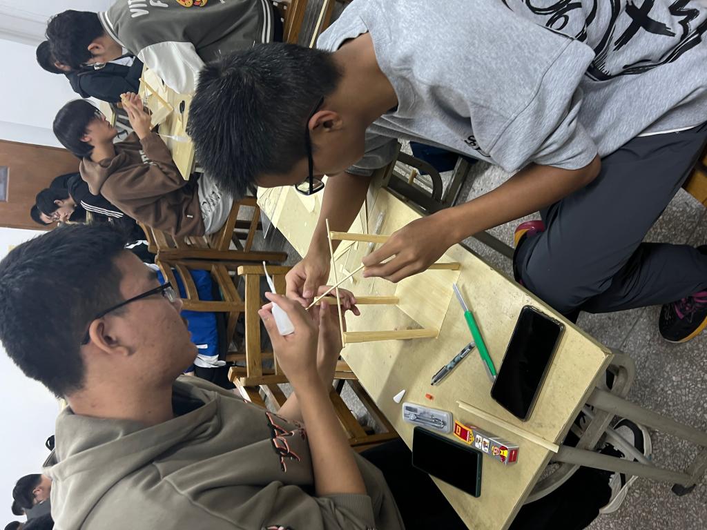 比赛在19日下午3点40准时开始,两位主持人对参赛者的到来表示欢迎,并为参赛者讲解了比赛规则以及评分标准。然后由土协部员为参赛者发放竹皮、木条、剪刀、胶水等原料和工具,紧接着参赛者开始了对古建筑模型的设计和拼搭然后宣布了比赛的开始。接着参赛者们开始了亭子模型的制作。工作人员对有疑问的参赛者积极的给予帮助。在经过两个小时的拼搭后,各个队伍进行了承重测试,土协部员参赛者进行拍摄和承重数据的记录,在最后一个队伍的测试之后承重比赛宣告结束。