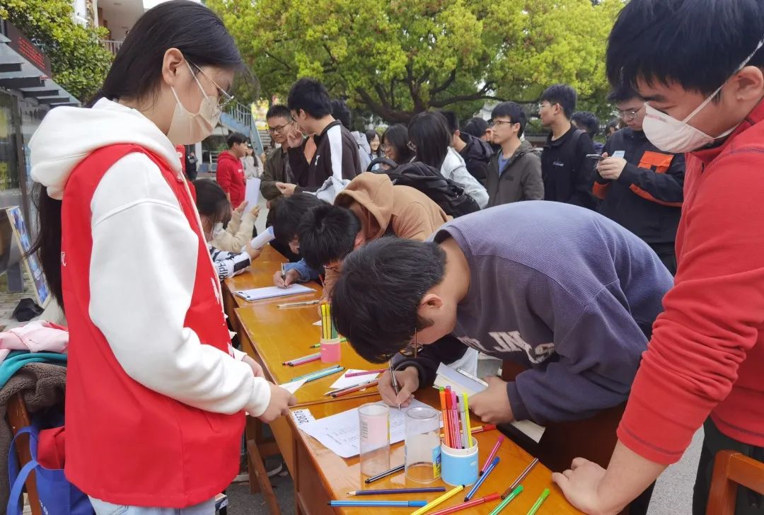 中午12点30分,志愿者们已经在指定位置摆好台位。本次摆台活动分为三个小活动:有奖问答、制作明信片、录制短视频并在横幅上签名。为了让同学们更了解孤独症,消除大众对孤独症的误解,本次问答围绕着孤独症提问。同时通过问答也为同学们科普了一些知识比如世界孤独症关注日在4月2日、孤独症又叫孤独性障碍等。本次活动有很多的同学们参与到其中,大家积极地为孤独症儿童制作明信片鼓励他们。后续志愿者们会筛选出精美的明信片,通过志愿活动送到孤独症儿童的手上。活动前一天志愿者们在活动场地后面挂好横幅。活动当天同学们在横幅上面签名为孤独症儿童加油助力并在横幅前录制关爱孤独症儿童的语录。非常多的同学参与了此次活动,给这些原本应该健康快乐成长的孩子们许多鼓励。所有爱心与耐心的举动,都是给孩子们架起的希望之桥。