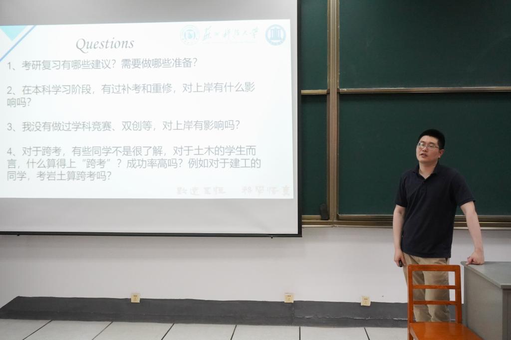 此次活动分为两个环节。第一环节,导师开讲。夏老师从所在团队研究的前沿技术与方向出发,结合实例为大家展示最新的研究成果及具体应用,对土木工程专业的前景进行深入分析和讲解,对该专业面临的机遇和挑战进行了深刻的阐述,对同学们未来发展方向给与指导。第二环节,师生交流。采用“一问一答”的形式,由主持人根据前期向同学们征集的问题进行提问,夏老师进行解答。夏老师指出,同学们要明确自身的考研目标与方向,学习并掌握多线程处理事情的方法,把握时间,制定好适宜自己的考研计划,合理备考。