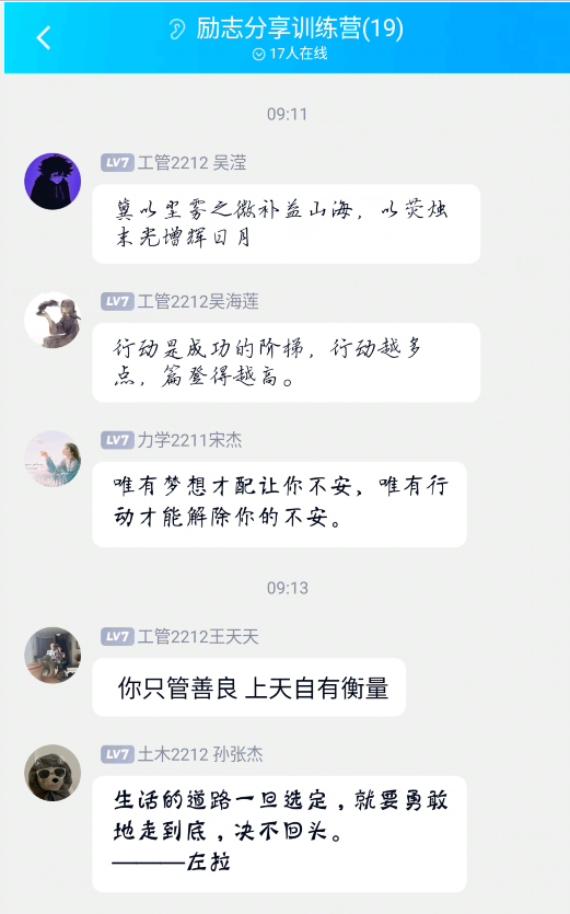 本次心理训练营活动通过知识科普讲座为理论支撑,各类群内每日打卡任务为实践,帮助学生养成积极心理,提升自我效能感,拓展心理素质。期待同学们通过此活动,能够养成理性对待逆境,提高心理承受能力,培养积极心理品质,收获幸福和成长。