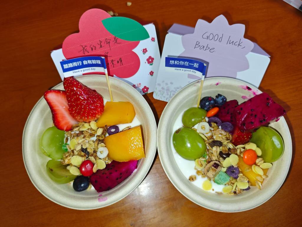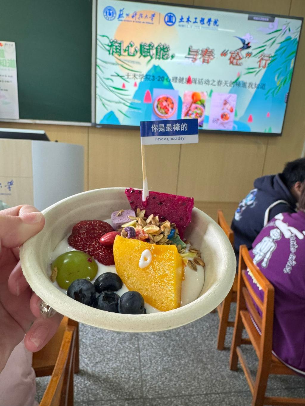3月19日下午,“春天的味道我知道——酸奶碗创意DIY”活动甜蜜来袭。活动以健康饮食为切入点,通过酸奶碗制作帮助学子释放学业压力,激发创造力。现场备有酸奶、燕麦片、坚果碎及缤纷水果,参与者自由搭配,创作专属“春日味道”。完成作品后,同学们还为酸奶碗撰写“甜蜜告白”,如“我的生命是一万次的春和景明”,后期,优秀作品还将通过学院公众号展示,传递温暖与幸福感。本次活动吸引40余名学生参与,现场欢声笑语不断,既普及了健康饮食理念,也助力学子以积极心态拥抱生活。