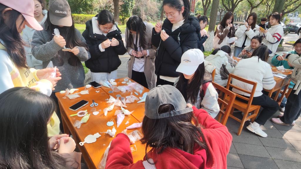 3月19日下午,江枫校区五松园广场迎来“胶出春日多巴胺——奶油胶DIY”活动。团队合作中,同学们将鲜亮奶油胶涂抹于手机壳、镜子等物品上,融入春日的色彩与活力。作品完成后,各组写下“多巴胺密码”贴于展板,如“总有一颗星星是为你亮的”。活动不仅让学子体验手工乐趣,更在协作中增强团队凝聚力。现场发放的纪念品也进一步点燃参与热情,成为心理健康周中一抹亮丽的“春日限定”。
