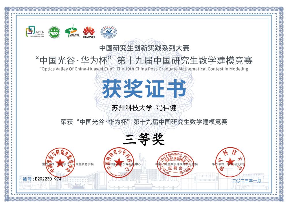 2022106日至10日,中国光谷·华为杯第十九届中国研究生数学建模竞赛顺利举行。本届竞赛吸引国外和国内各省(自治区、直辖市、特别行政区)共465个研究生培养单位的17970队研究生参赛,历经近两个月的严谨阅评,近日获奖名单揭晓,我院研究生冯伟健在本次竞赛中获得三等奖。