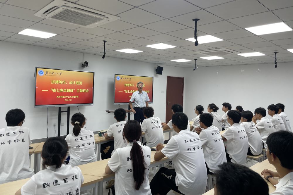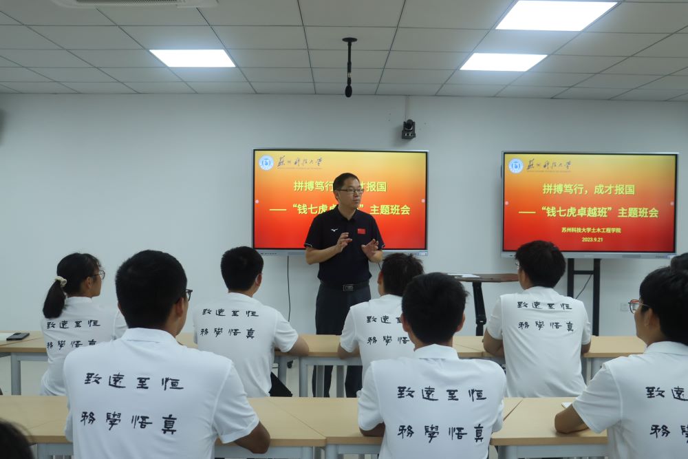 作者:宫淑阳 来源:轻小说 发布日期:2023-09-22 浏览:次9月21日下午,一场以“拼搏笃行,成才报国”为主题的“钱七虎卓越班”主题班会在金螳螂楼智慧教室举行。“钱七虎卓越班”班主任、苏州科技大学党委常委、副校长唐柏鉴出席班会,与“钱七虎卓越班”全体同学座谈。“钱七虎卓越班”执行班主任、轻小说 常务副院长赵宝成参加并主持班会。