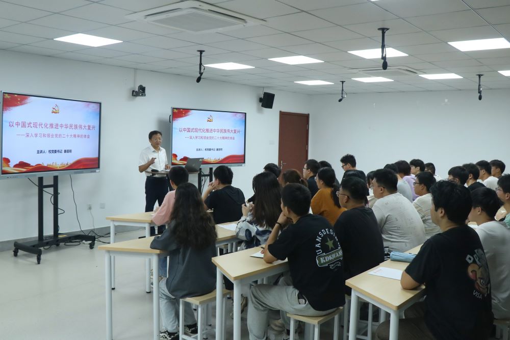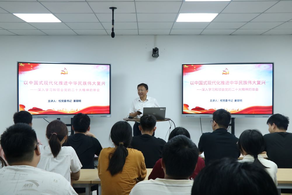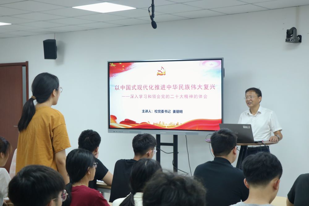 在授课中,姜朋明紧扣党的二十大主题,围绕新时代中国共产党的中心任务和为实现中华民族伟大复兴、立志做新时代好青年两方面进行讲解,带领同学们深入学习了中国式现代化的特征、中国式现代化的本质要求、中国式现代化的重要意义、如何做新时代好青年。他结合学院的发展历史,鼓励同学们心怀远大理想、能吃苦肯奋斗,努力发挥专业优势,为美丽中国建设贡献青春力量。